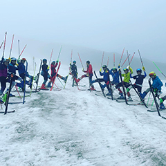 国内で行う夏の雪上合宿。上手くなるためにはスキー/ブーツを履く事が必要不可欠。自身の足を使って登り滑る、1本1本の重要さを覚えていきます。